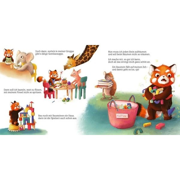 Tilly, das Pandakind, ist ein ziemlich temperamentvoller kleiner Roter Panda. Tilly kann flitzen und gut klettern, sie stürmt fröhlich und mit lautem Hallo los, sie ist mutig und zeigt, was ihr nicht passt. Tillys Wunsch nach Selbstbestimmtheit und ihr Wille sind stark, doch ihre Frustrationsgrenze noch niedrig. Immer wieder spürt sie die Wut im Bauch. Lästern die großen Geschwister, wie babyklein ihr Spielzeug sei … Tilly wird wütend. Bittet Mama zu warten, weil der Babybruder versorgt werden muss … Tilly wird wütend. Selbst wenn es Brot statt Pizza gibt, in der Kita gerade Bastelzeit statt Tobezeit ist … Tilly wird wütend. Und manchmal überrollt die Wut das kleine Pandakind so sehr, dass sie stampft und schreit. Dann möchte sie kratzen, beißen und mit Dingen werfen. Doch wie gut, dass Mama weiß, wie das ist mit der Wut im Bauch. Und sie weiß auch, dass wir die Wut nicht verbieten können. Aber ihr zuhören, damit sie kleiner werden kann.