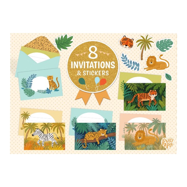 Das Set enthält 8 hochwertig verarbeitete Einladungskarten mit vier verschiedenen Tiermotiven (jeweils 2-fach), 8 farblich abgestimmte Umschläge sowie 2 Stickerbögen zur individuellen Gestaltung. Die Karten sind innen liniert und erleichtern so das saubere und klare Beschriften.