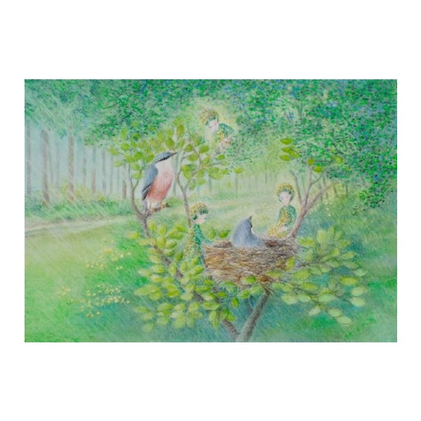 Mit feinem Strich und weichen Farben entführt Monika Speck in eine magische Welt zwischen Natur und Fantasie. Die Kunstkarte „Die Nestwächter“ zeigt ein behutsam gezeichnetes Nest, beschützt von elfenhaften Wesen, umgeben von Vögeln – eine stille Szene voller Zauber, Schutz und Geborgenheit.