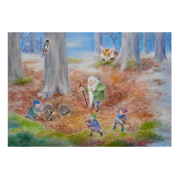 In warmen Herbsttönen erzählt die stimmungsvolle Kunstkarte „Ein Igelbett aus Laub“ eine poetische Waldszene voller Ruhe und Fürsorge. Zwerge bereiten inmitten herabgefallener Blätter ein weiches Nest für die Igel vor – ein liebevoller Akt der Achtsamkeit gegenüber der Natur. Neugierig beobachten ein Fuchs und ein Vogel das Geschehen, als stille Zeugen dieser herbstlichen Vorbereitung auf den Winter.