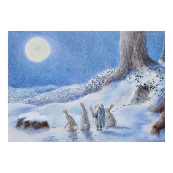 Ein klarer Nachthimmel, sanftes Mondlicht über einer verschneiten Landschaft – und darunter ein Gnom am Eingang seines Baumwurzelhauses, begleitet von drei lauschenden Hasen.