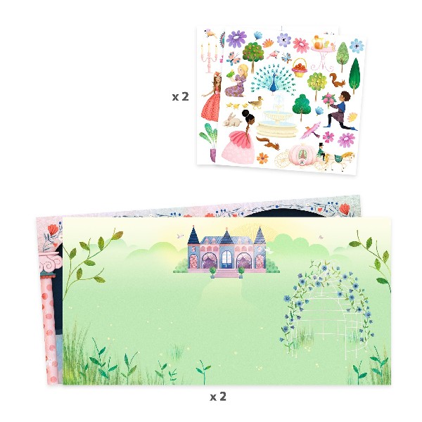 Das Stickeralbum „Leben im Schloss“ lädt Kinder ab 4 Jahren zum kreativen Geschichtenerzählen ein. Zwei große Panorama-Hintergründe – ein königlicher Garten und ein prachtvoller Ballsaal – bieten reichlich Platz für fantasievolle Szenen, die mit über 50 wiederverwendbaren Vinylstickern gestaltet werden können.