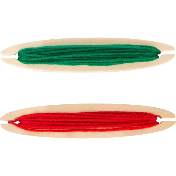 4 Webschiffchen die mit unterschiedlich farbigen Wollfäden